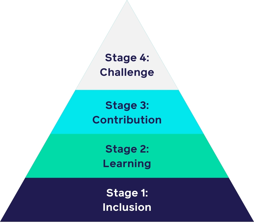 The inclusion stage is the feeling of belonging. I.e., you’re accepted and respected as part of the team. Without inclusion, people conserve energy, stay quiet, and avoid risk from the start.
